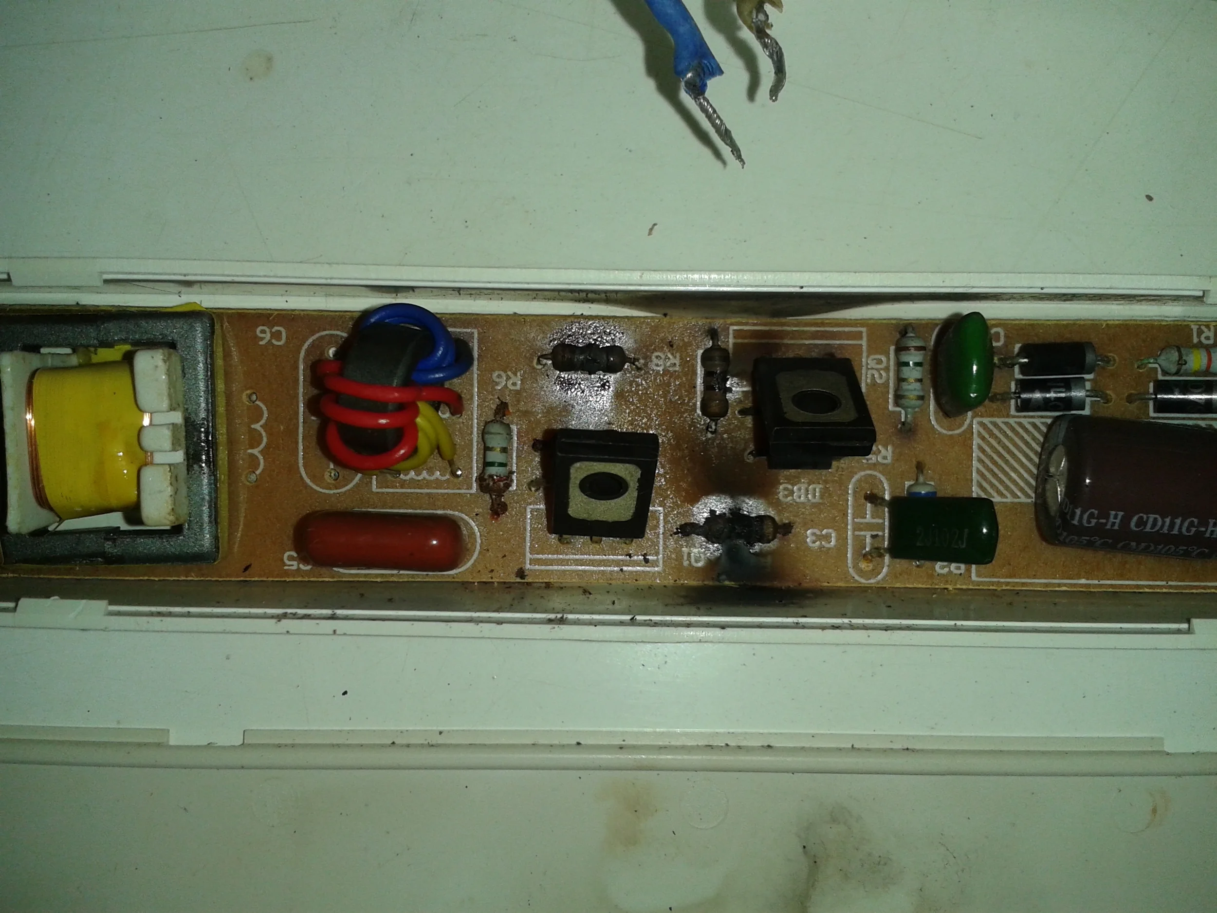 Une vue intérieure du ballast électronique calciné soit par une surtension, soit par la condensation suite à l'humidité.